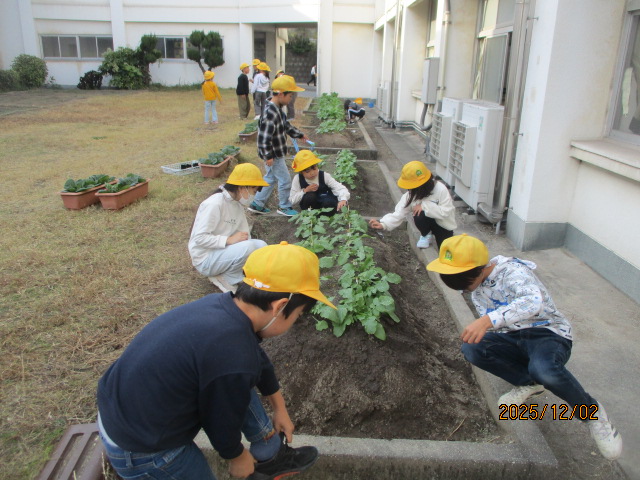 2年生は各学級の畑で大根の栽培をしています。土の中の大根の成長を想像しながら、草取りや水やりをしています。おいしい大根に育ちますように・・・